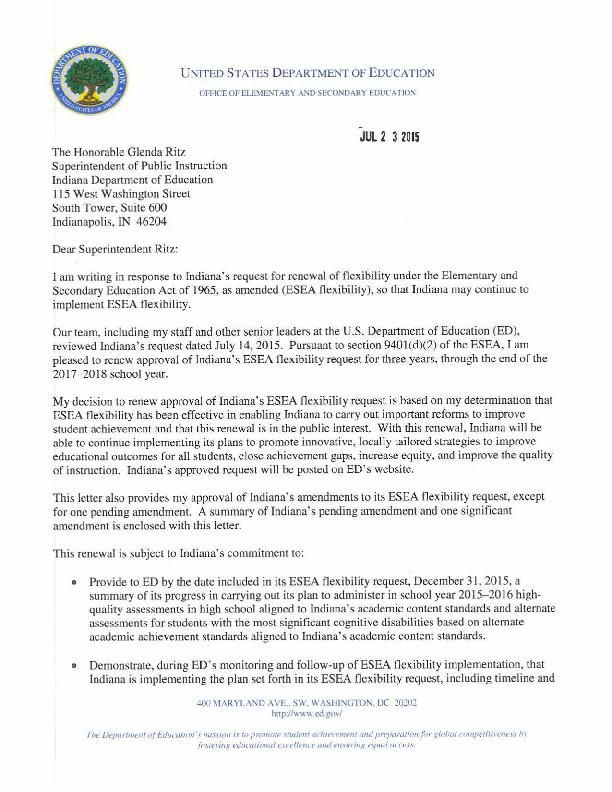 U S Dept Of Education Letter Approving Indiana S Nclb Waiver